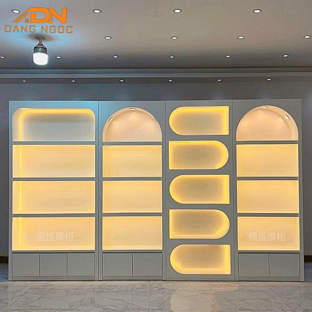 - Shop Mỹ phẩm, Nước hoa: Tủ thường kết hợp cửa kính và đèn LED. Ánh sáng sẽ giúp sản phẩm trông lung linh và cao cấp hơn.