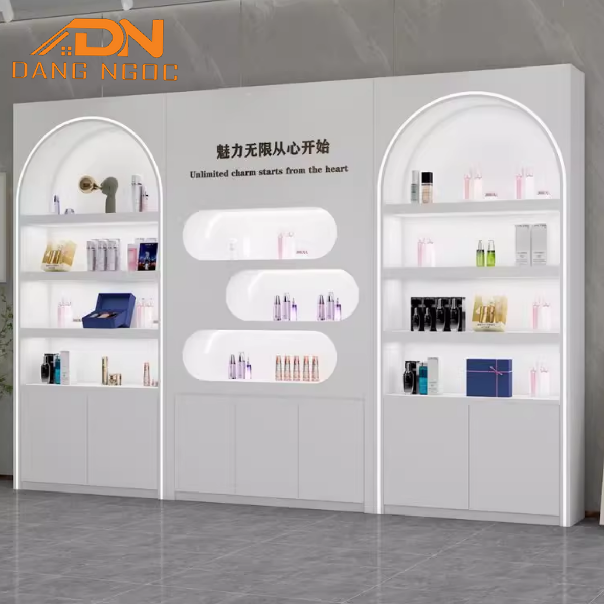 - Shop Mỹ phẩm, Nước hoa: Tủ thường kết hợp cửa kính và đèn LED. Ánh sáng sẽ giúp sản phẩm trông lung linh và cao cấp hơn.